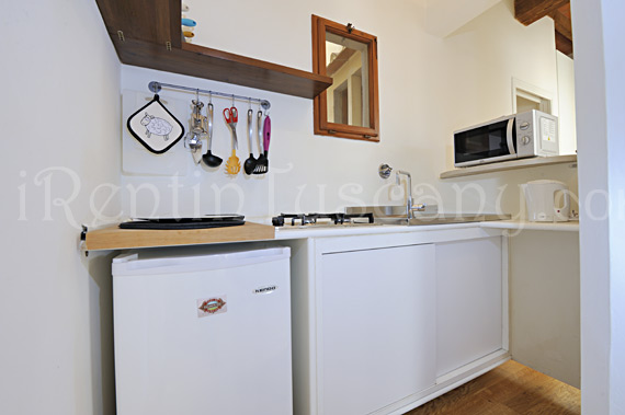 The kitchen is equipped with utensils, microwave, 2-burner stove, small fridge, electric kettle, and Italian coffee maker.